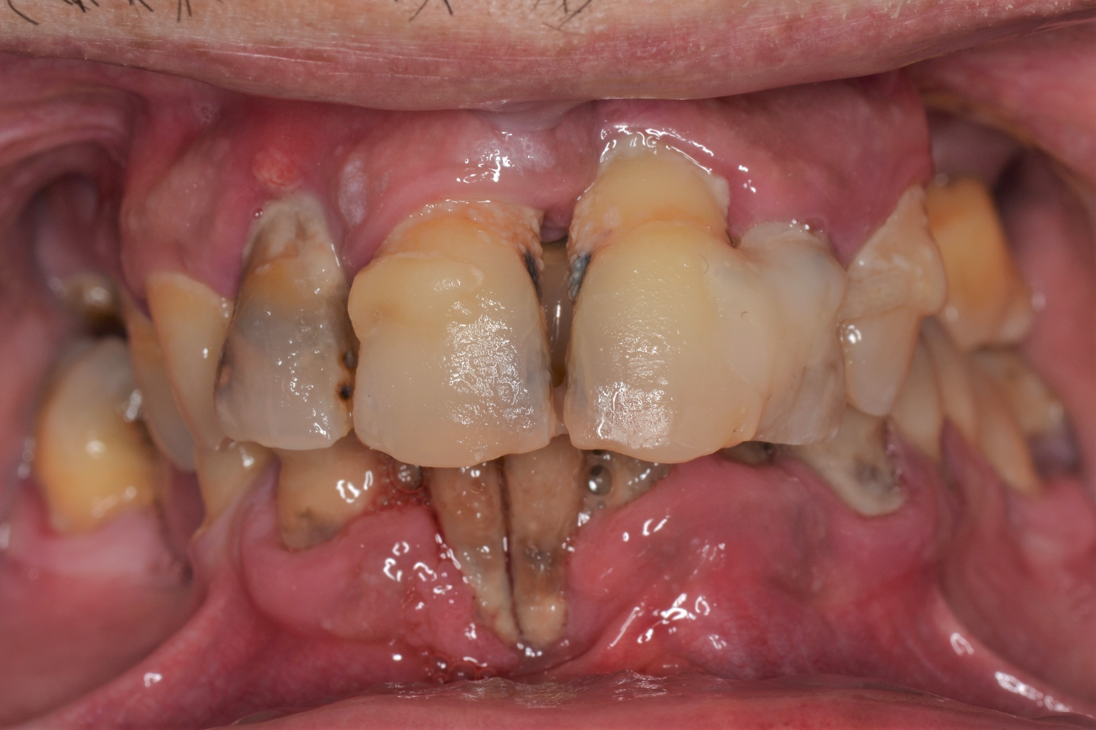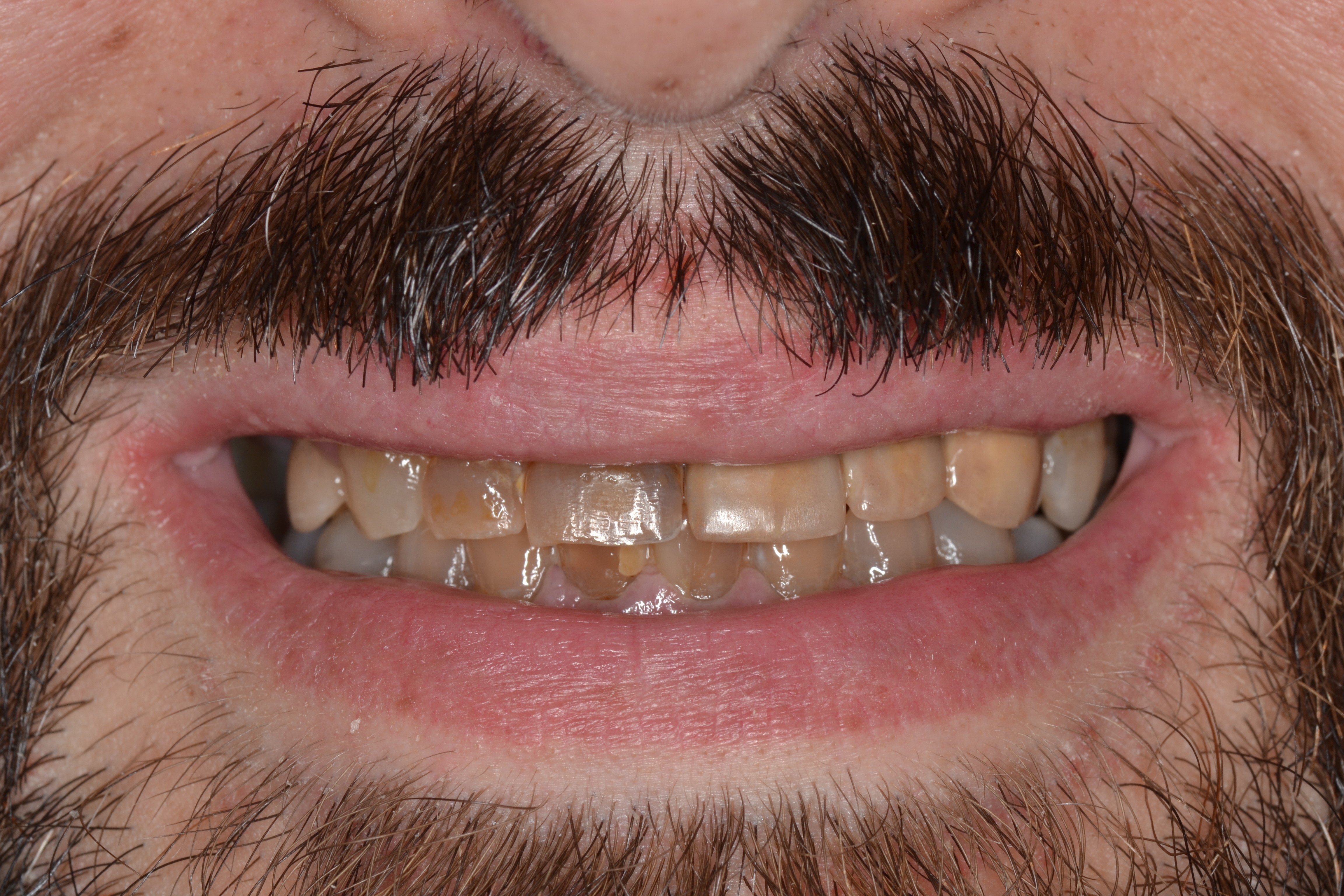 Ο ασθενής αυτός ήταν έντονα δυσαρεστημένος με την εμφάνιση των άνω και κάτω δοντιών του. Τα δοντια του ηταν σε τερματικό στάδιο και η μάσηση ήταν σχεδόν αδύνατη.