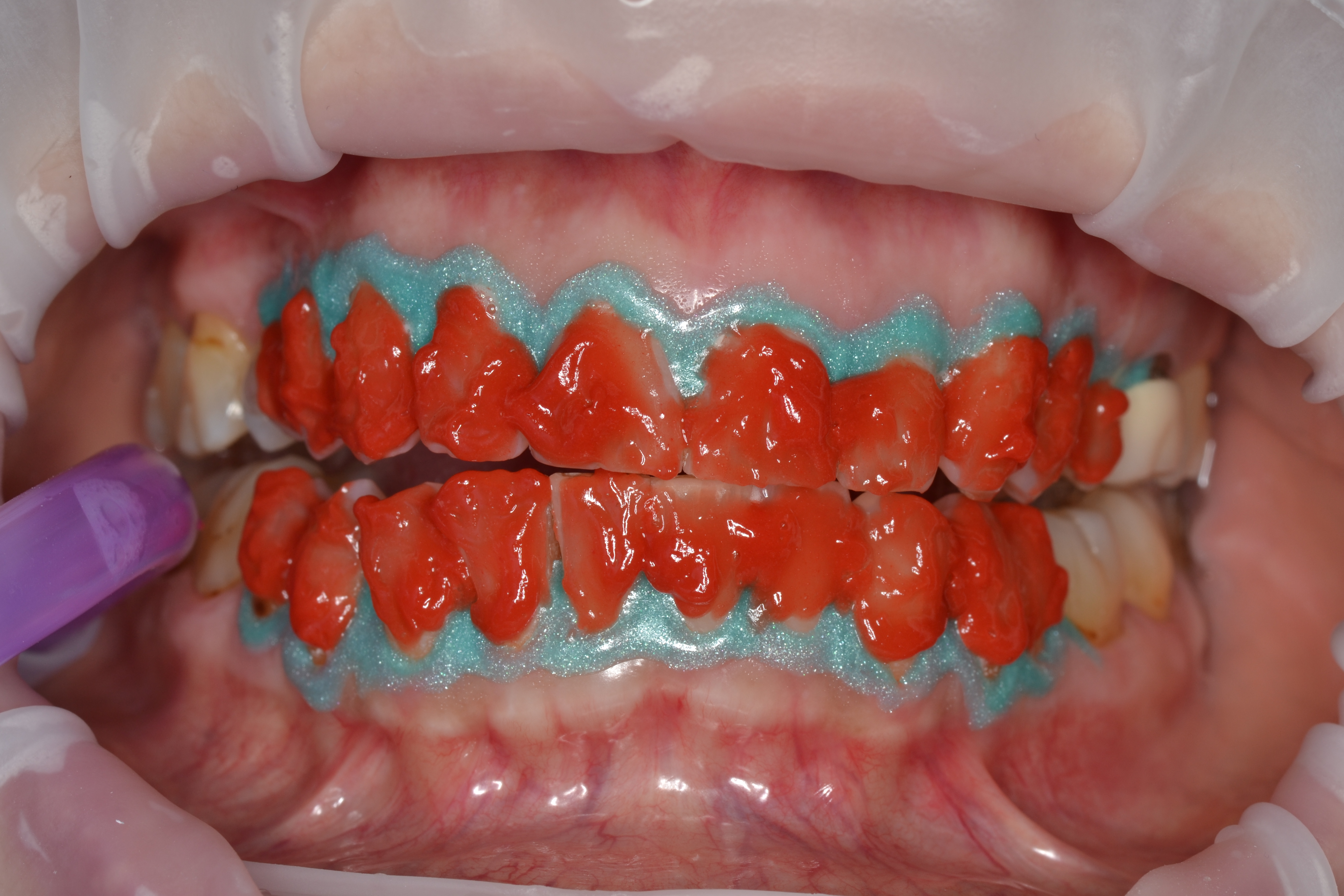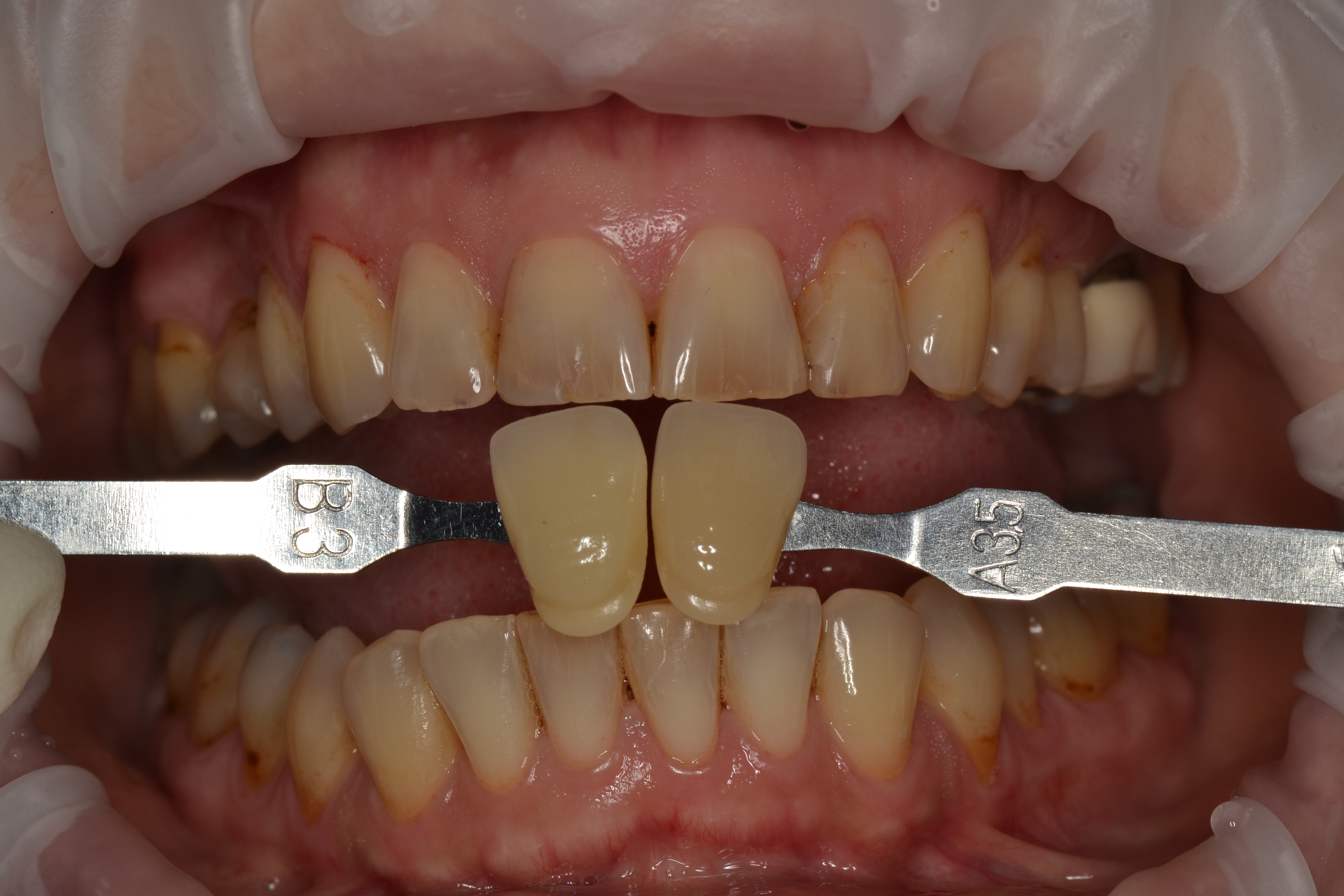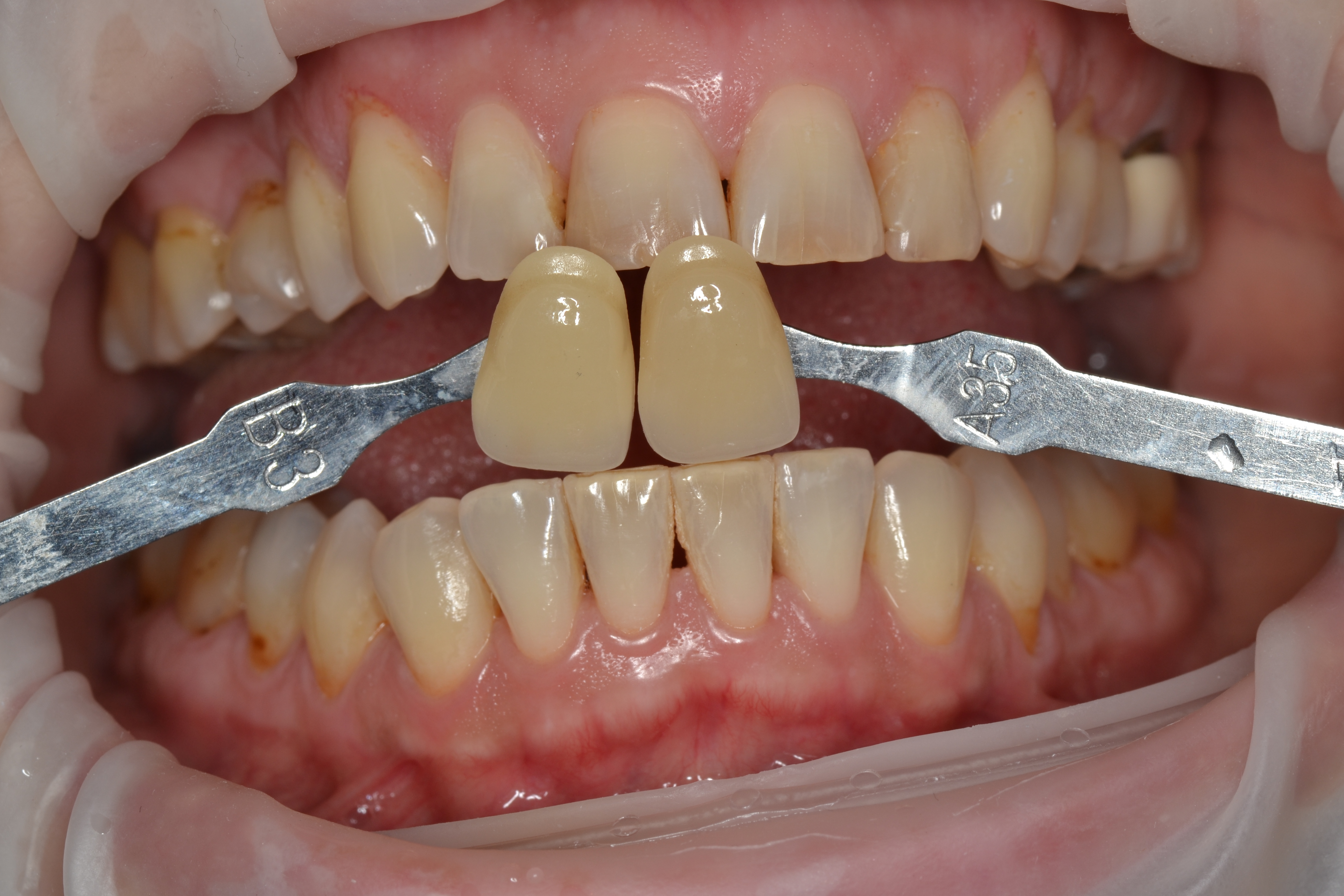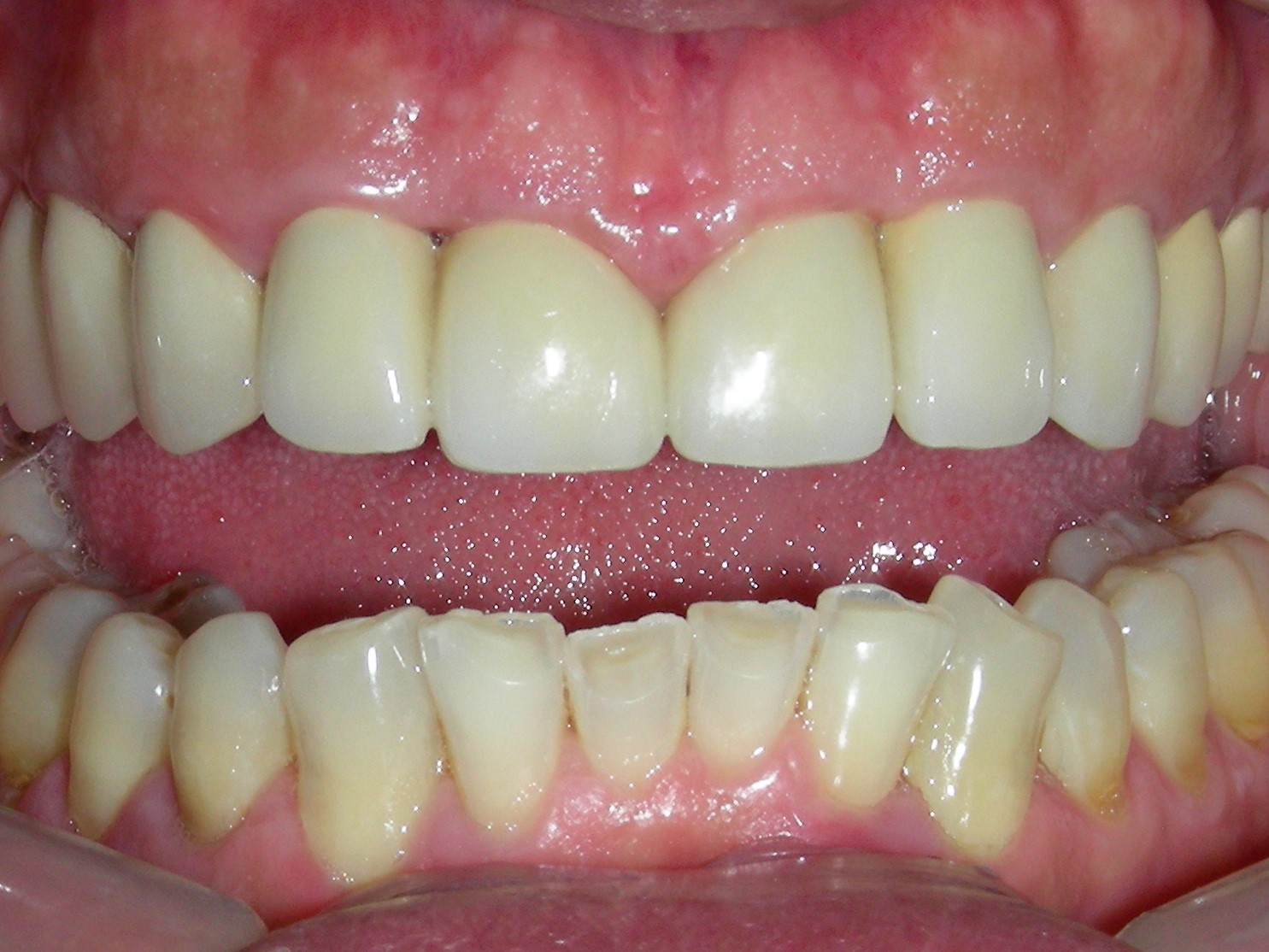 Στα άνω δοντια κατασκευάστηκαν νέες στεφάνες πορσελάνης για να προσομοιάζουν το χρώμα των κάτω δοντιών.