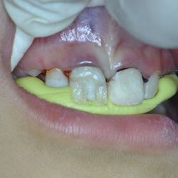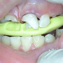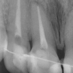 This young patient had completed an orthodontic treatment which had led to pulp necrosis in her upper right central and lateral incisor.