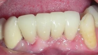 The worn and discolored lower central and lateral incisors in this heavy smoker were restored to their previous shade using 4 all-ceramic E-max veneers.
